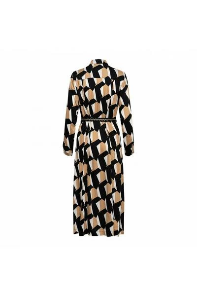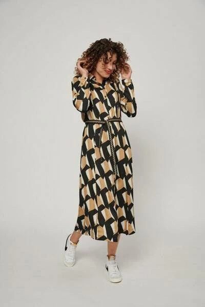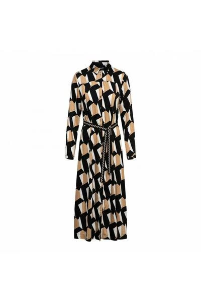 Deze longdress met knoopsluiting loopt iets uit en is uitgevoerd in een soepel vallende crêpekwaliteit in allover-design.