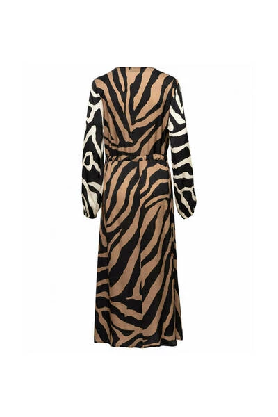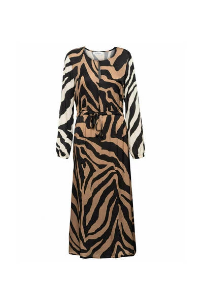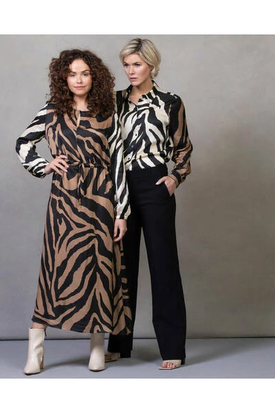 Lange mouwen met elastiek in de mouwzoom. De jurk heeft een ronde halslijn met een splitje middenvoor en een koordje in de taille. De kleur van de tijgerprint is contrasterend van crème naar tan.